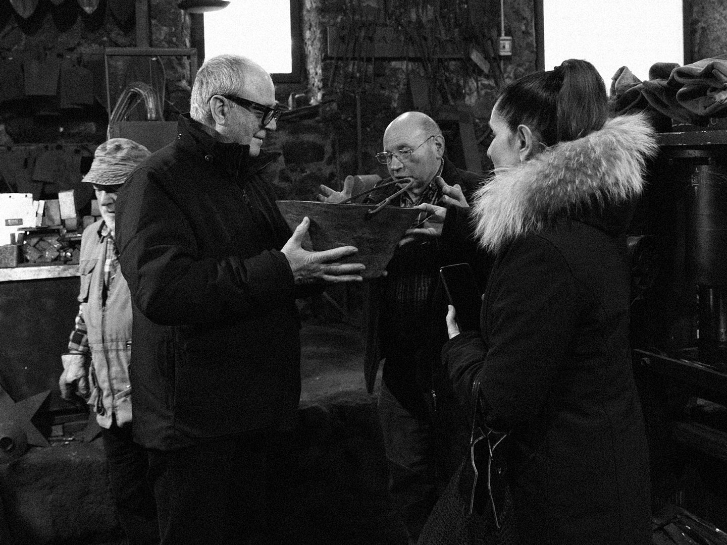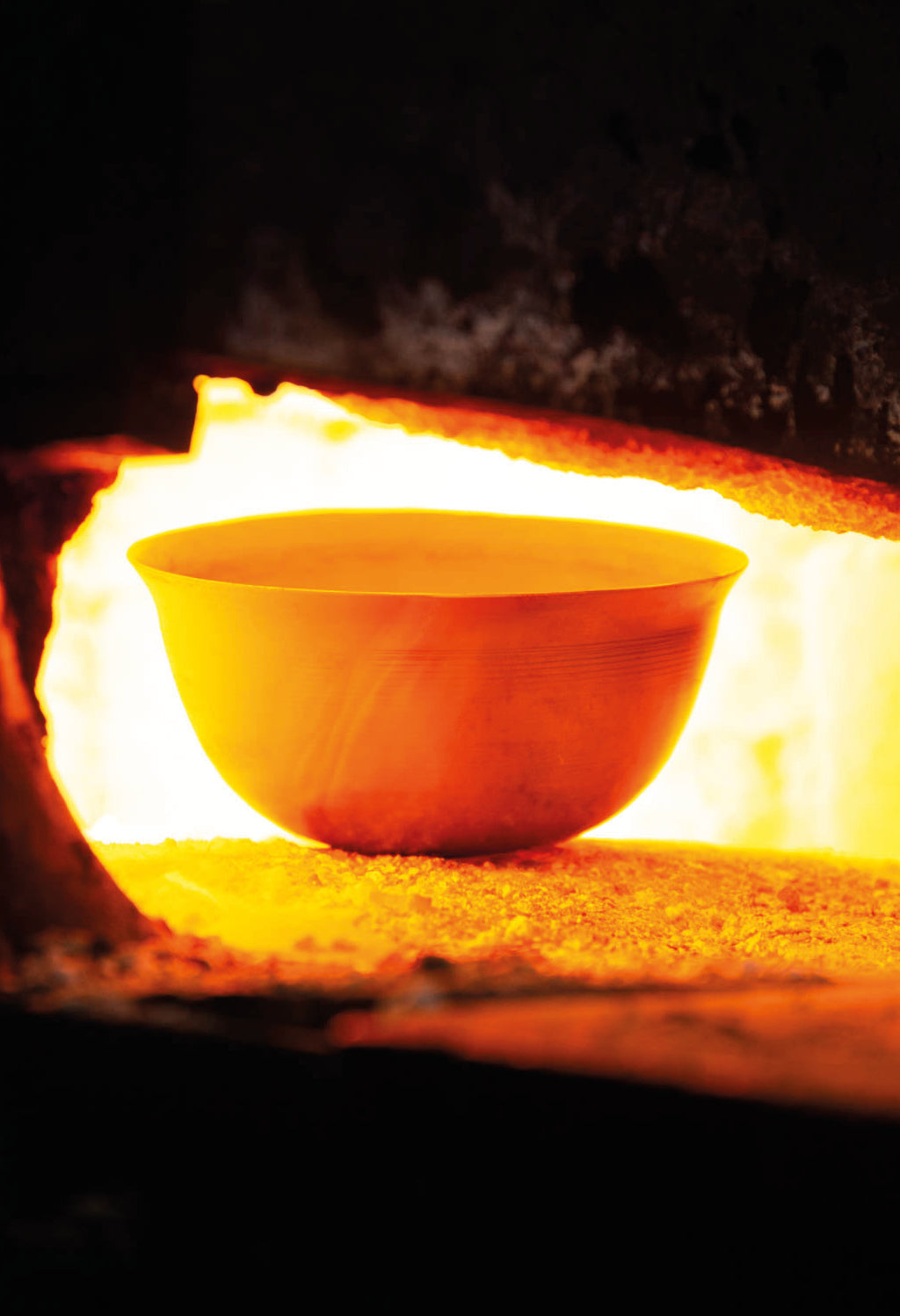 To create it, Iacchetti was inspired by a helmet turned upside down towards the sky, thus giving the artifact a strong expressive charge. The author subverts the meaning of a war symbol, transforming it into a gentle artifact. “It is an archetypal project par excellence, a shapeless form that does not deny all the efforts of the designers throughout history, but lives on its own.” Alberto Alessi commented.Handcrafted on the lathe, the cup is then passed through fire to become incandescent and absorb beeswax that protects it from rust, a traditional and ecological practice typical of the artisans of the Valley.