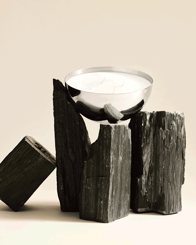 The research began from a selection of stones particularly meaningful to the designer, who developed the fragrances in collaboration with one of the most prestigious perfume houses in Grasse: Robertet. The geographic context in which each mineral is found was studied to identify a series of olfactory notes capable of conveying not only the material’s intrinsic characteristics, but also its cultural background. This led to six fragrances — Marble, Basalt, Amber, Amethyst, Clay, and Flint — the result of a memory and imagination exercise ending in an apparent sensory paradox.