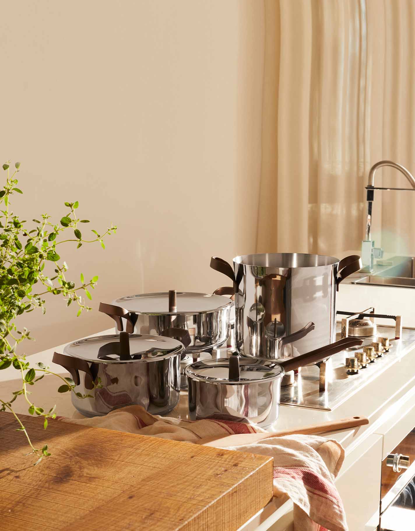 The design of the Edo series is softened by formal elements such as the light flare of the containers or the line of the handles reminiscent of ribbons pinned to a dress, which becomes a distinctive feature of the entire the entire cookware line.